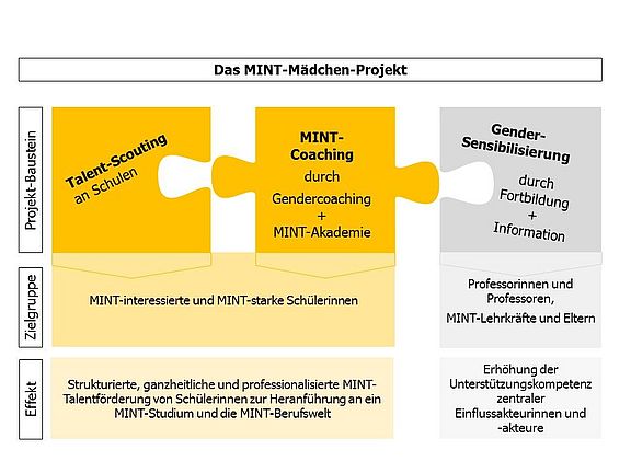 Ziel des MINT-Mädchen-Projekts ist es, Schülerinnen für ein MINT-Studium und für einen weiteren Weg in einen zukunftsträchtigen Beruf im MINT-Bereich mit Führungsverantwortung zu bestärken. Neben Maßnahmen, die für die teilnehmenden Mädchen durchgeführt werden, sind auch Eltern und Lehrkräfte als relevante Personengruppen einzubeziehen, die insbesondere für Mädchen in der Phase der Studienfachwahl eine relevante Rolle bei der Entscheidungsfindung spielen. Somit sind Maßnahmen für zwei Zielgruppen – einmal die Mädchen selbst und einmal ihre relevanten EinlfussakteurInnen – Bestandteil des genderdidaktischen Konzepts im vorliegenden Projekt, wobei die Maßnahmen für die Mädchen natürlich den Schwerpunkt bilden. Aus nachstehender Skizze gehen die Projekt-Bausteine in Zuordnung zur jeweiligen Zielgruppe hervor.